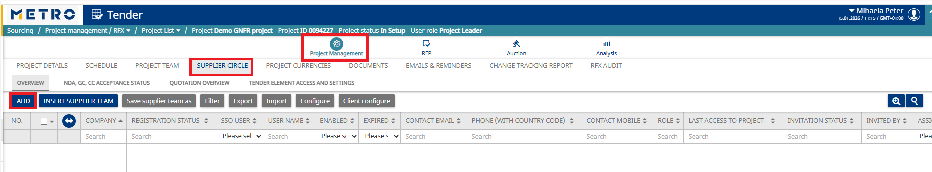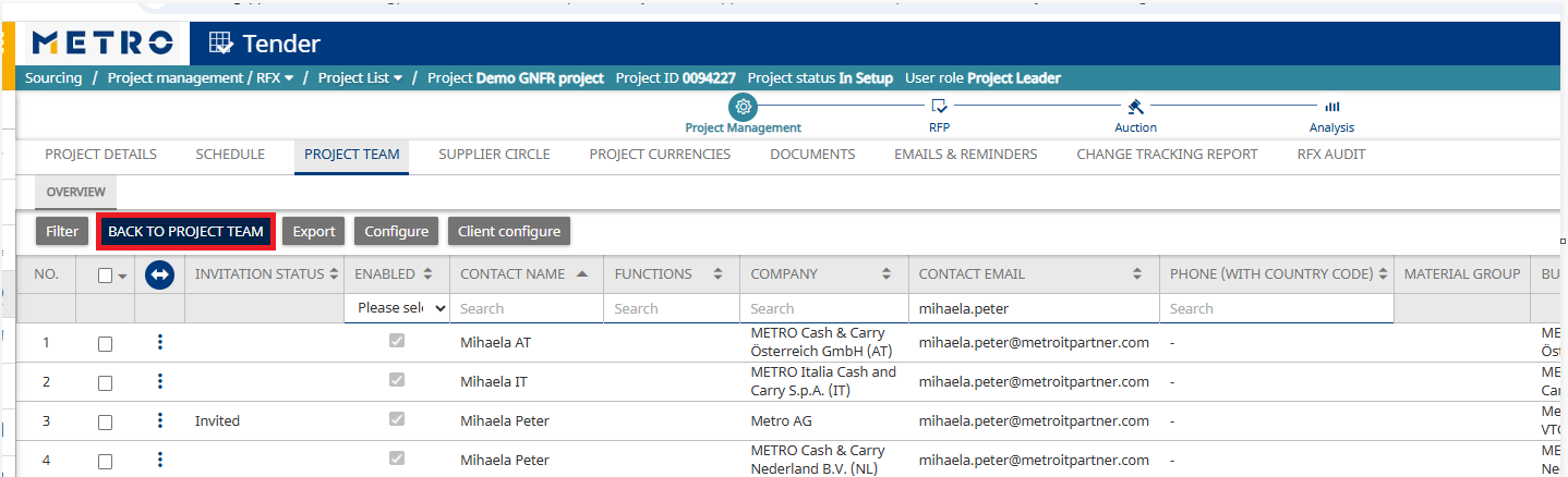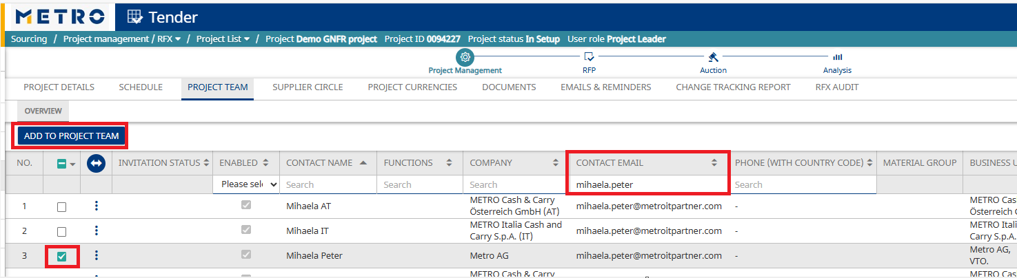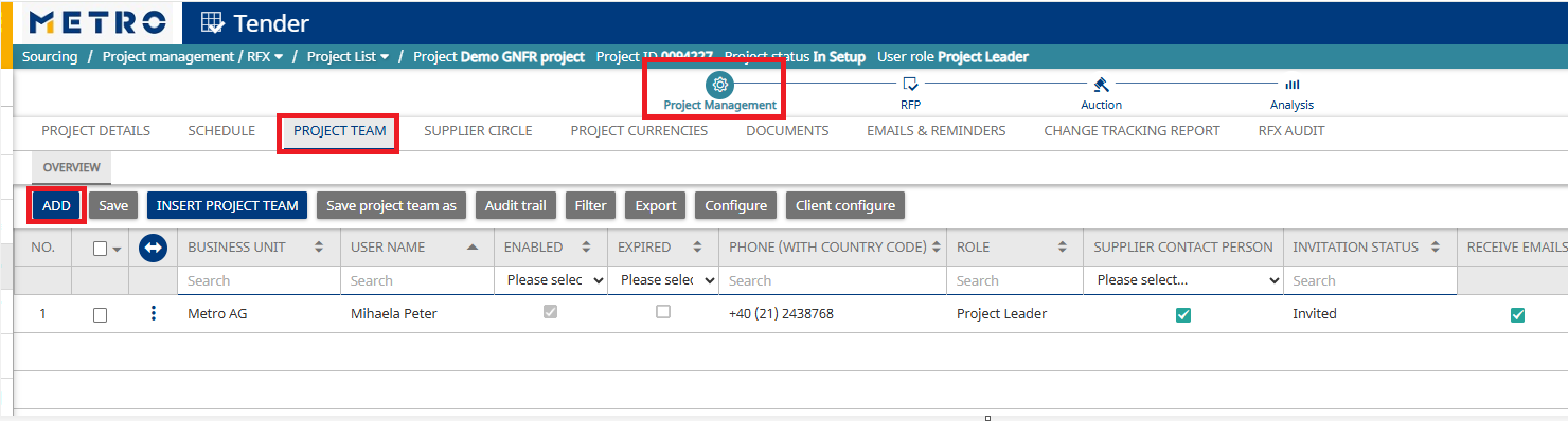 - Navigate to Project Team and click Add to invite colleagues from your country and internal users who need access to the project.