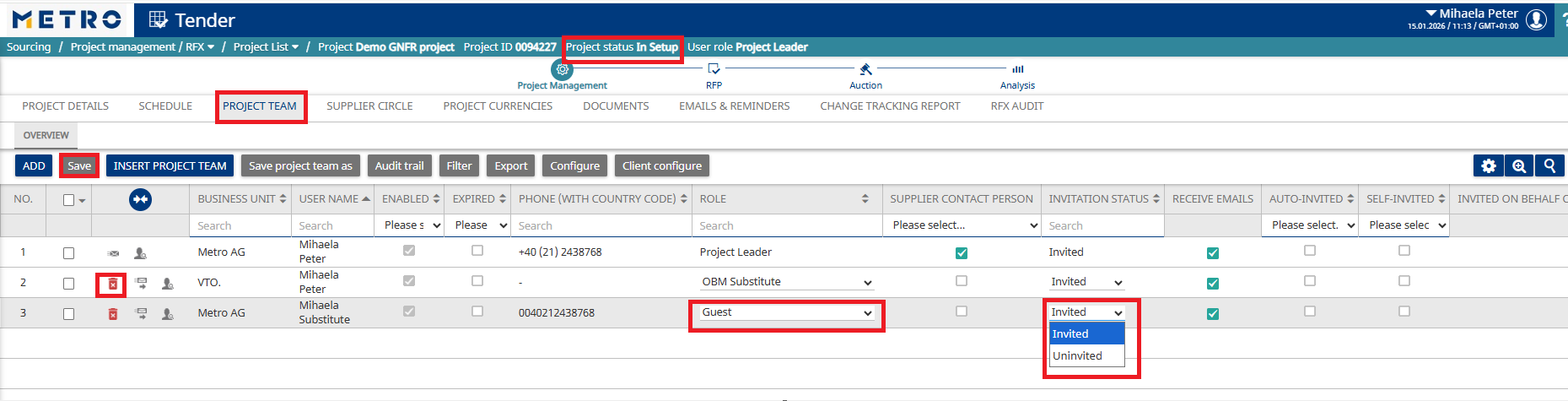 - If the project is no longer In Setup, set the invitation status to Uninvited to remove a user.