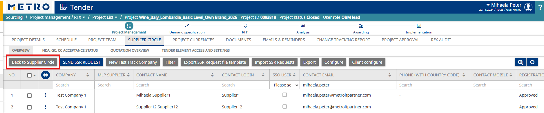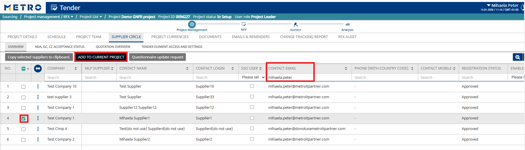 - Search for the supplier (by company name, username, email, etc.), select them, and click Add to Current Project.