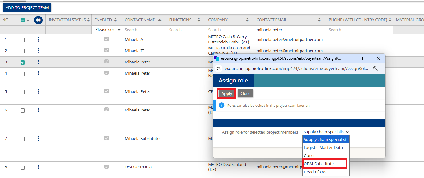 - OBM Substitute: same rights as the project leader; assign to a colleague who can replace you.