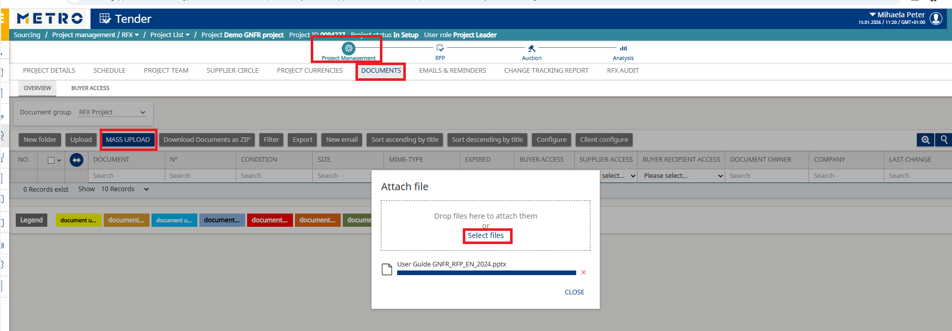 - Navigate to Documents and click Mass Upload to attach files for buyers and suppliers.